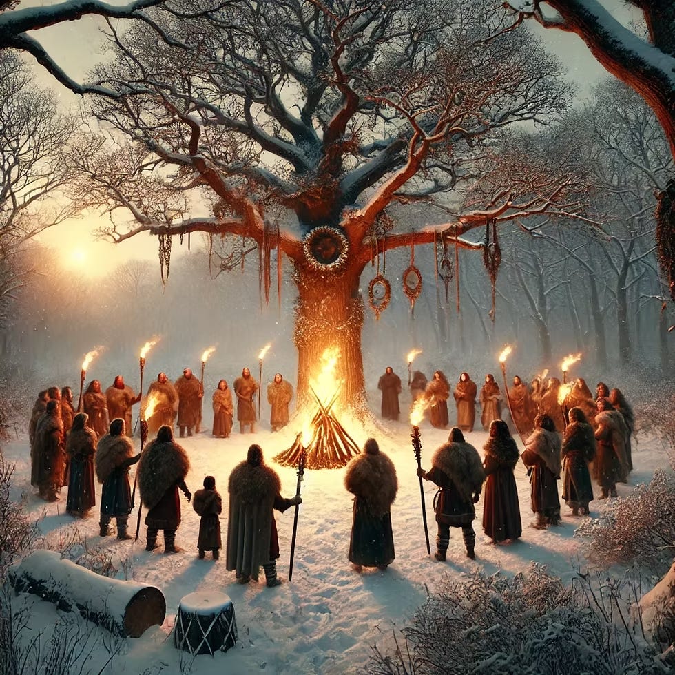 Pagans celebrated the Winter Solstice to honor the rebirth of the sun and the turning of the year, marking the end of darkness and the start of longer days, symbolizing new beginnings, hope, and reflection on cycles of life, death, and rebirth through traditions like lighting fires, decorating with evergreens, feasting, and setting intentions for the coming year.